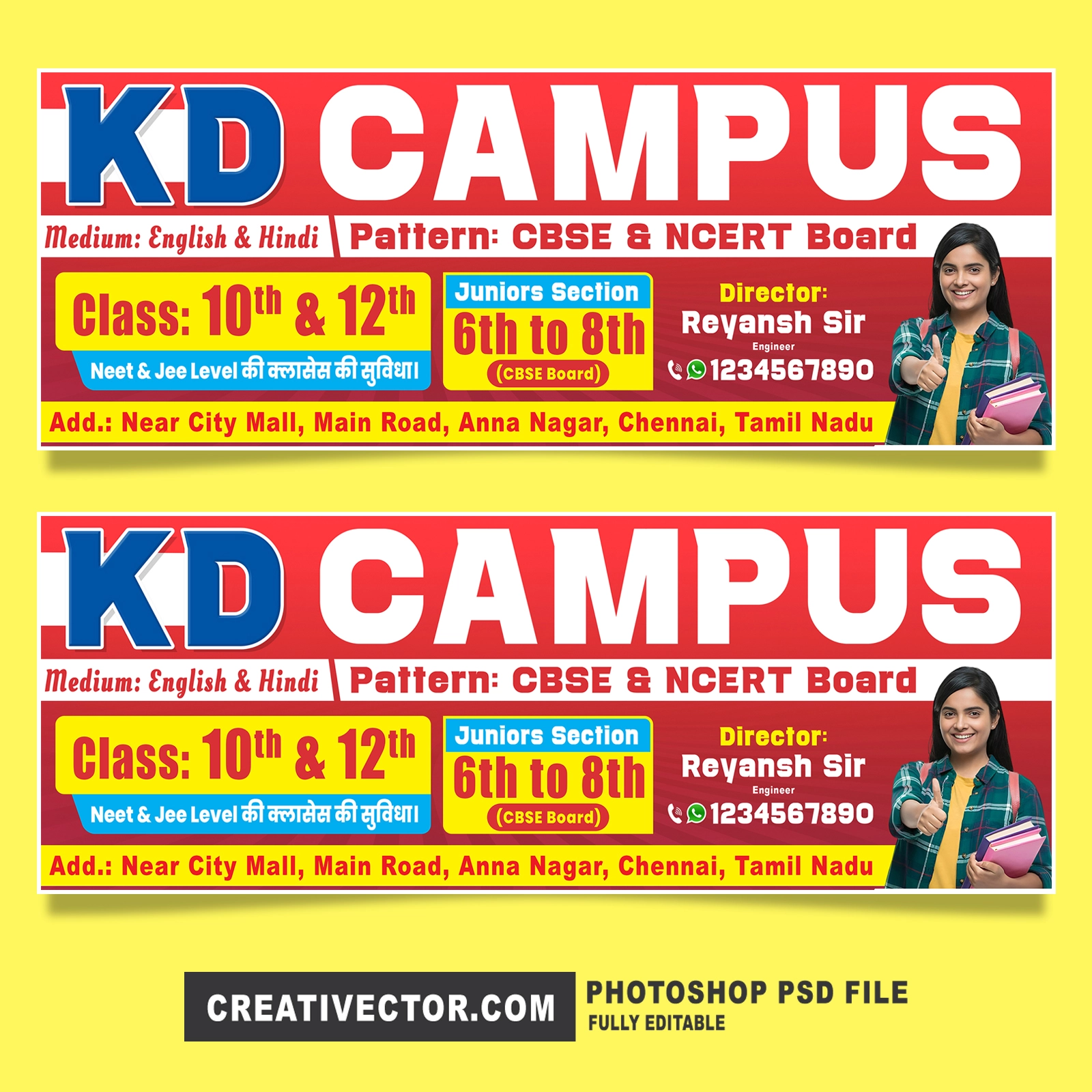 With a clean, modern, and professional layout, this template effectively highlights your courses, contact information, and special features — making it ideal for school coaching, competitive exam classes, spoken English courses, NEET/JEE coaching, and more.