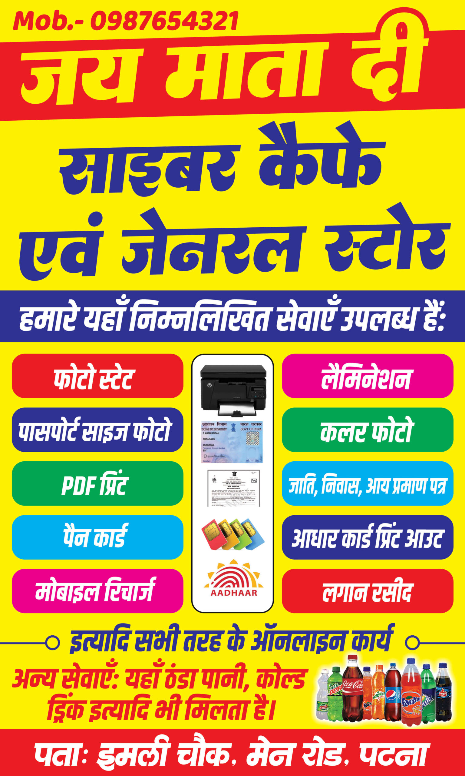Along with digital services, the design also promotes general store and kirana store offerings, including items like cold drinks and water, helping attract both service-based and walk-in retail customers. The bottom area is cleanly organized to display address and contact details clearly, ensuring easy customer reach.