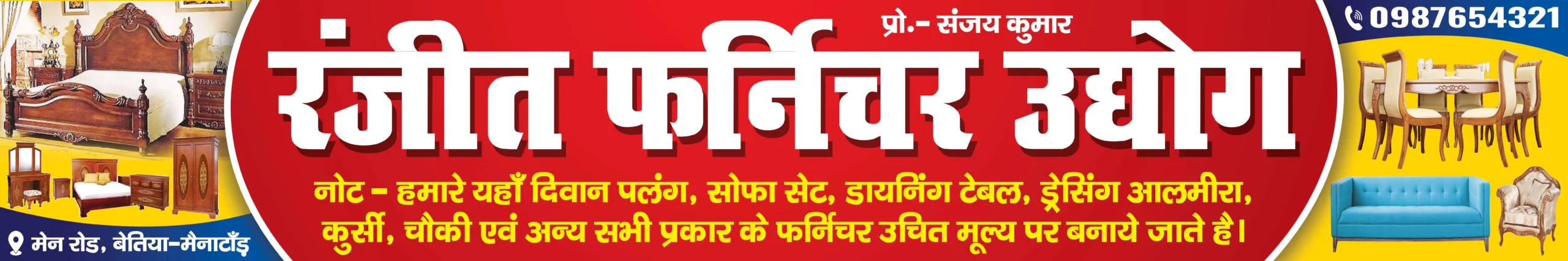 Professional furniture shop banner design PSD featuring sofa set, bed, dining table, dressing almirah, chair and wooden furniture visuals. High-quality printable layout ideal for furniture showroom promotion, shop hoardings, flex banners and local advertising use.