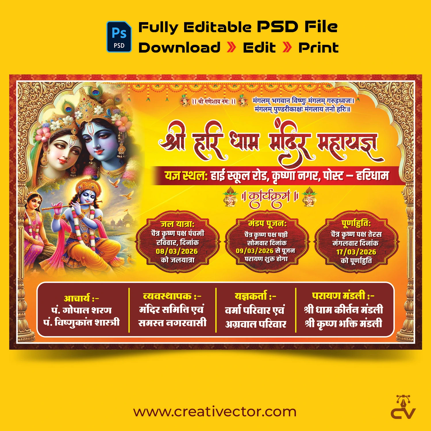 Traditional Hindu Mahayagya banner layout for puja ceremonies, spiritual gatherings and temple programs. Devotional theme with event schedule, jal yatra, mandap pujan and purnahuti sections. Editable PSD ideal for flex and poster printing.