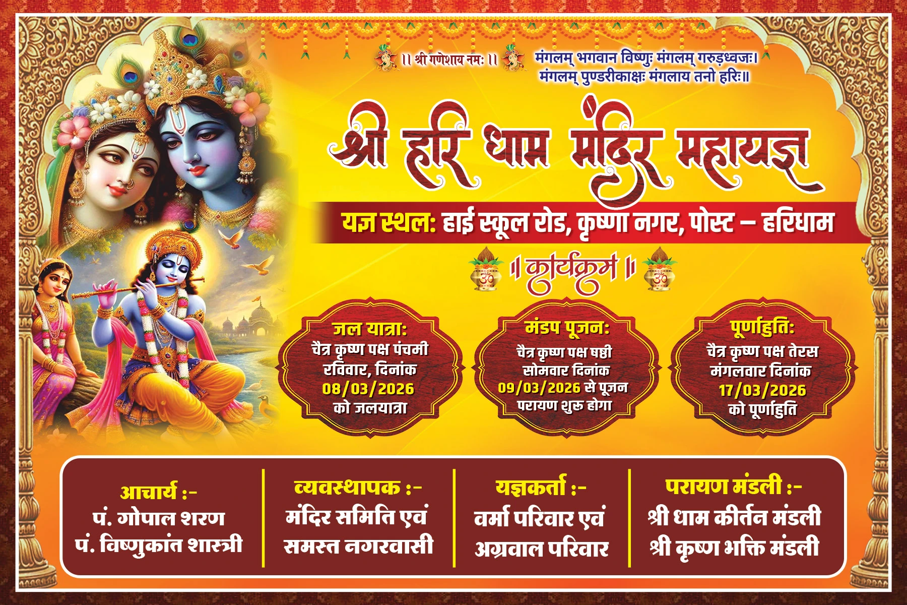 There is ample space to include information about acharyas, yajman families, organizing committees and supporting groups. The divine visuals enhance trust and make the design suitable for temple surroundings, street publicity and community invitations.