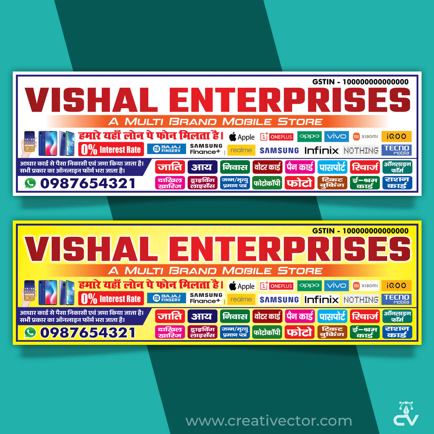 Professional mobile shop banner design PSD for multi brand smartphone store promotion. High resolution flex banner template with smartphone brand layout, EMI highlight section and print ready design. Fully editable layered PSD for mobile showroom advertising and flex printing.